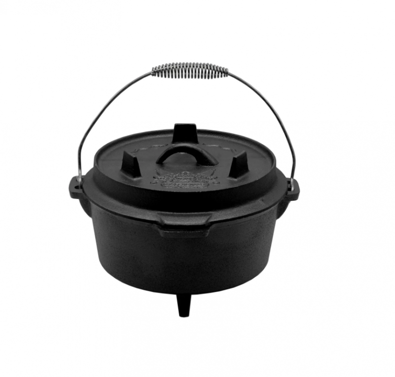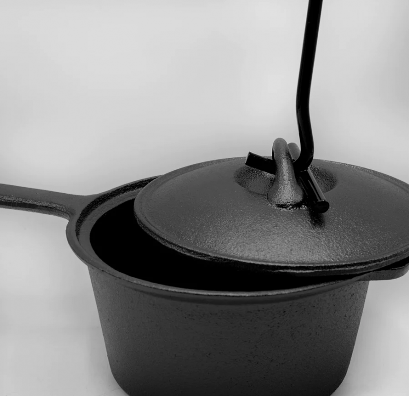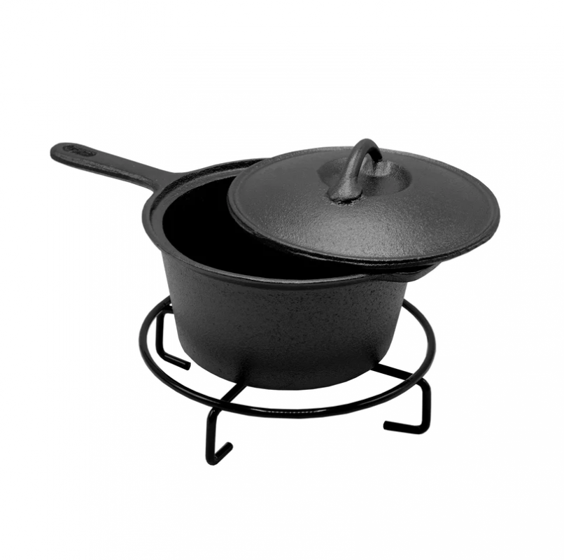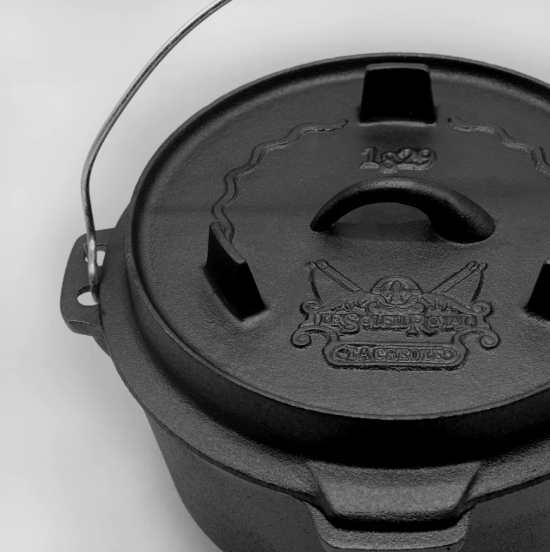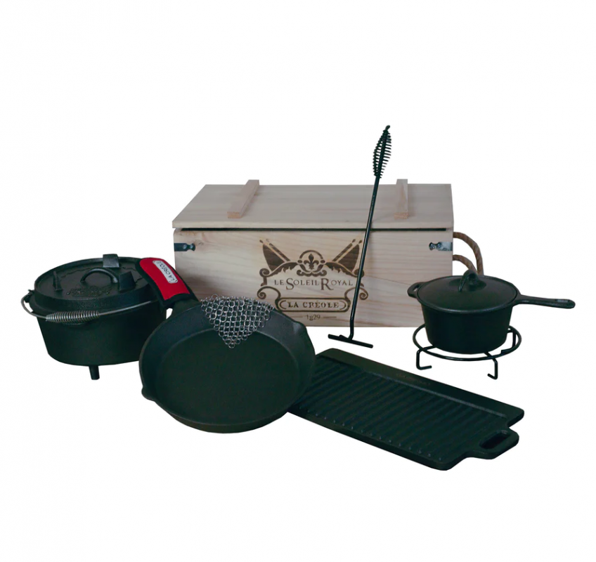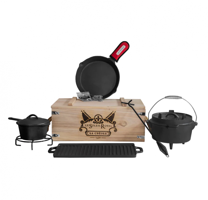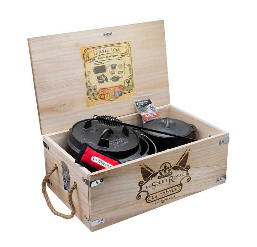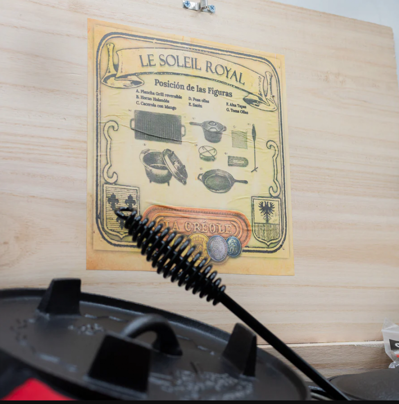 Contiene: Horno Holandés, Plancha Grill Reversible, Malla de limpieza, Alza tapa, Sarten, Olla con mango y base, caja de madera.